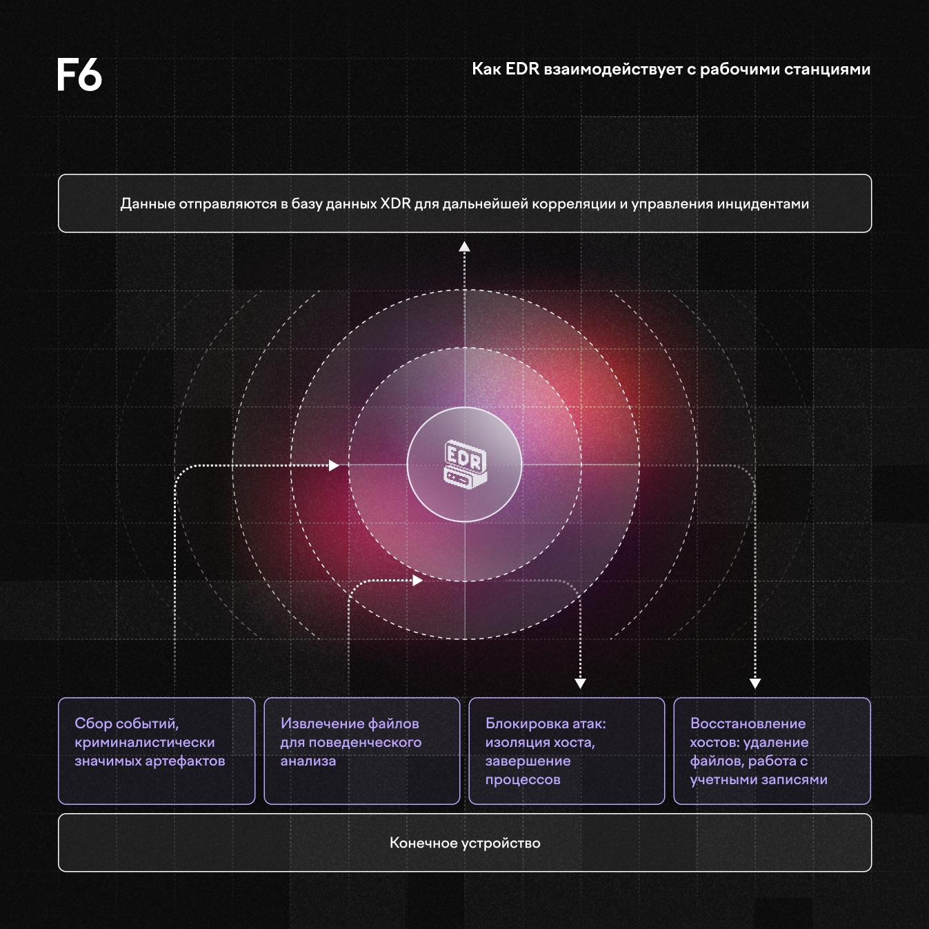 В составе F6 Managed XDR этот модуль разворачивается на устройствах. Он связывается с консолью, которая коррелирует события ИБ и помогает находить угрозы.