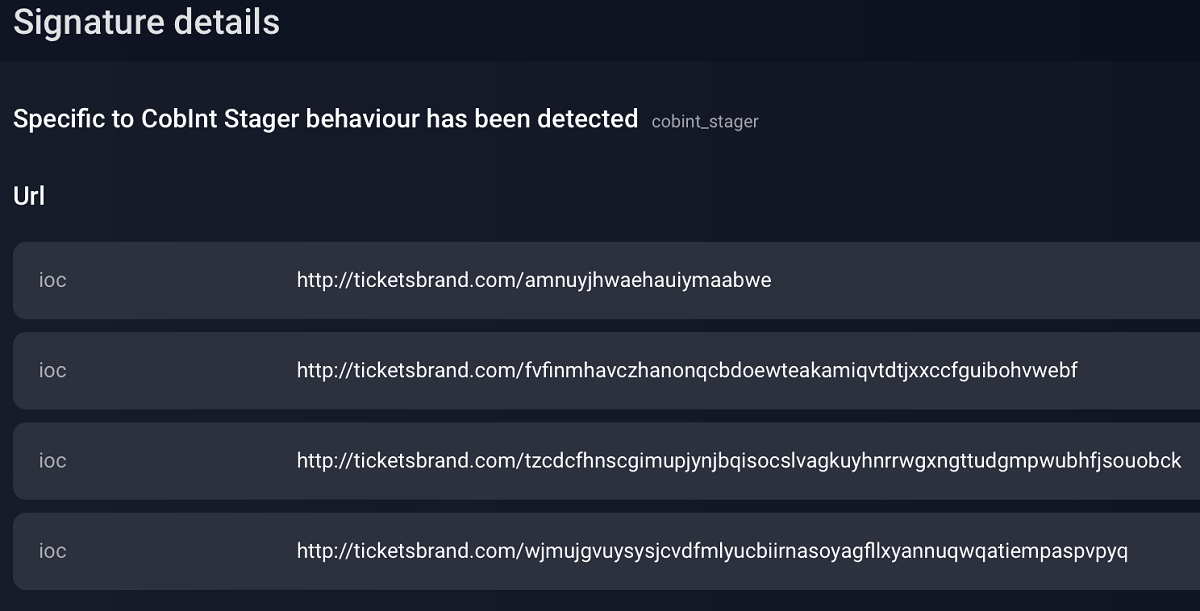 Результат анализа: скрипт содержал шелл-код для загрузки программы ReflectiveLoader с адреса hxxps://ticketsbrand[.]com, которая является загрузчиком бэкдора CobInt.