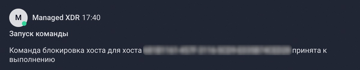 Модуль F6 способен изолировать хост для ограничения любых сетевых взаимодействий, кроме управляющего F6 Managed XDR. Таким образом хост теряет доступ даже к собственной локальной сети. Это помогает оборвать канал управления злоумышленников, но при этом сохранить доступ для специалистов. Все это позволяет вовремя отреагировать на инцидент и собрать необходимые данные.