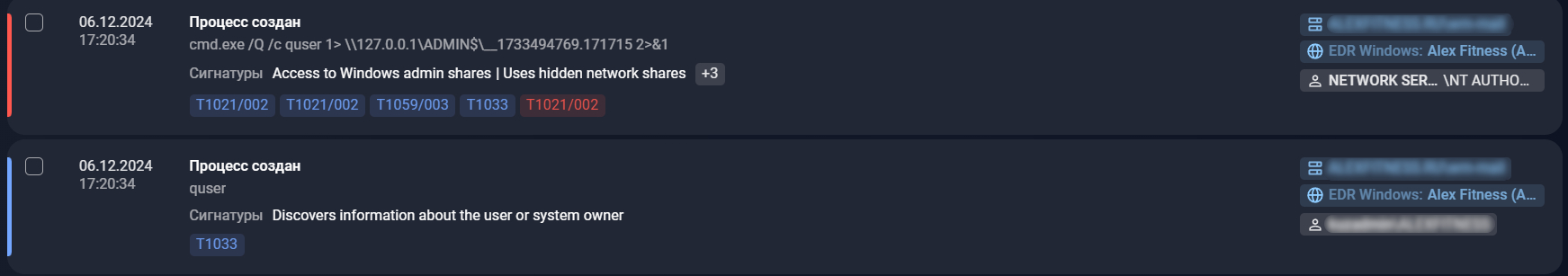 Анализ собранных данных позволил выяснить, что выявленная атака развивалась достаточно стремительно. Проэксплуатировав уязвимости почтового сервера Microsoft Exchange, атакующие создали локального пользователя и подключились к серверу по протоколу RDP. Получив доступ к внутреннему сегменту сети, злоумышленники сразу приступили к разведке ИТ-инфраструктуры и обогащению аутентификационными данными при помощи таких инструментов, как ADRecon и mimikatz, а также штатных утилит Windows. Имея необходимые для развития атаки данные, злоумышленники подключались к различным устройствам с целью увеличения поверхности атаки и обеспечения резервных каналов доступа. Во время одного из таких подключений они и были обнаружены системой F6 MXDR.