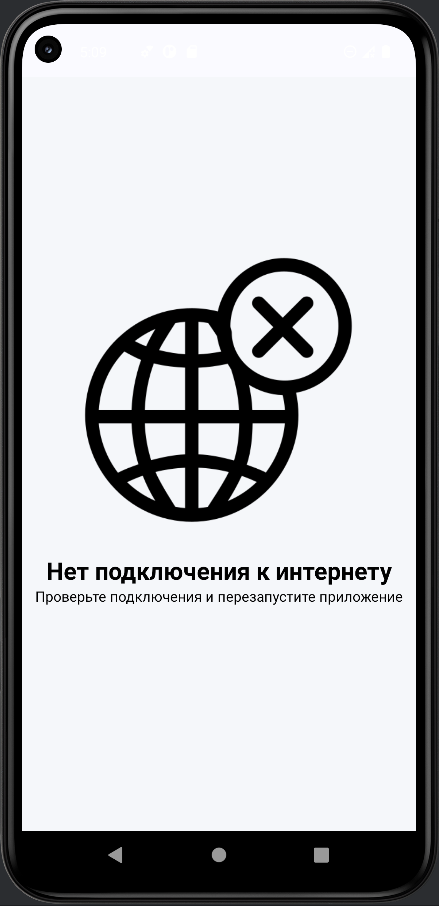 После запуска приложение выполнит проверку наличия прав создания уведомлений на устройстве и игнорирования оптимизация батареи. Если такие права выданы (не первый запуск), то приложение перейдет к отображению окна для ввода трек номера. Если же приложение запущено впервые, то выполняется проверка интернет соединения, при его отсутствии отображает пользователю соответствующую информацию (Рис. 2).