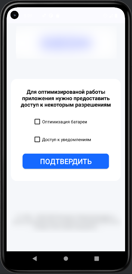 После отображения данной активности будет выполнена проверка и запрос недостающих прав для чтения СМС и отслеживания звонков, среди которых: android.permission.READ_SMS, android.permission.RECEIVE_SMS, android.permission.READ_PHONE_STATE, android.permission.CALL_PHONE, android.permission.SEND_SMS.