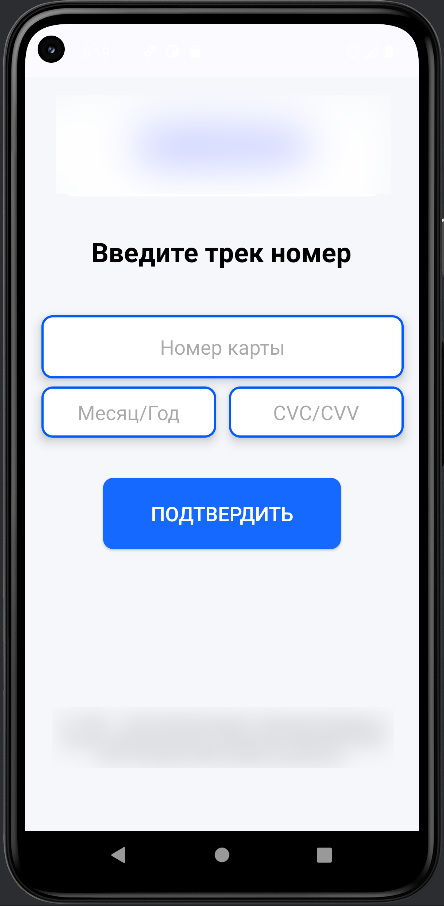 Card-активность предназначена для ввода пользователем информации о банковской карте. В данном случае параметром из ответа от командного сервера модерируется текстовое поле, по умолчанию содержащее строку «Введите трек номер». Если пользователь введет данные банковской карты и нажмет кнопку «подтвердить», то ему будет отображена активность с анимацией загрузки, а также будет выполнен POST-запрос к URL-ссылке: hxxps://akokakola[.]com/send-card, содержащий информацию о введенных значениях банковской карты (подробнее в разделе «HTTP-коммуникация»).