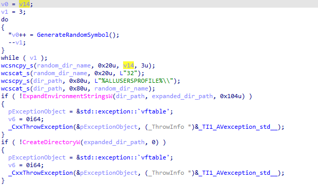 2. Отличаются путь сохранения полезной нагрузки и имя сохраняемого на диск файла — в этом случае пейлоад сохраняется в директорию %ALLUSERSPROFILE%, имя поддиректории является следствием конкатенации случайной трехбуквенной строки и символов «32», а имя файла — случайная четырехбуквенная строка + «.dll». По итогу полный путь сохранения «дропнутого» файла выглядит следующим образом — %ALLUSERSPROFILE%\ <random_3_letters>32\<random_4_letters>.dll (пример — %ALLUSERSPROFILE%\osd32\dbsf.dll).