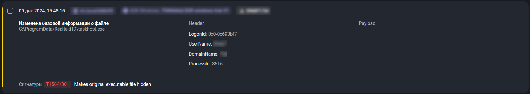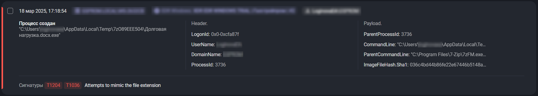 | Маскировка (T1036: Masquerading) | Злоумышленники могут изменять свойства файлов, чтобы они выглядели легитимными или безопасными для пользователей и/или средств защиты. Маскировка реализуется через подмену имени или расположения объекта с целью обойти механизмы защиты и мониторинга. Примеры включают подделку метаданных файлов, ввод пользователей в заблуждение, затрудняющий определение типа файла, и присвоение задачам или сервисам правдоподобных, «легитимных» имён. |