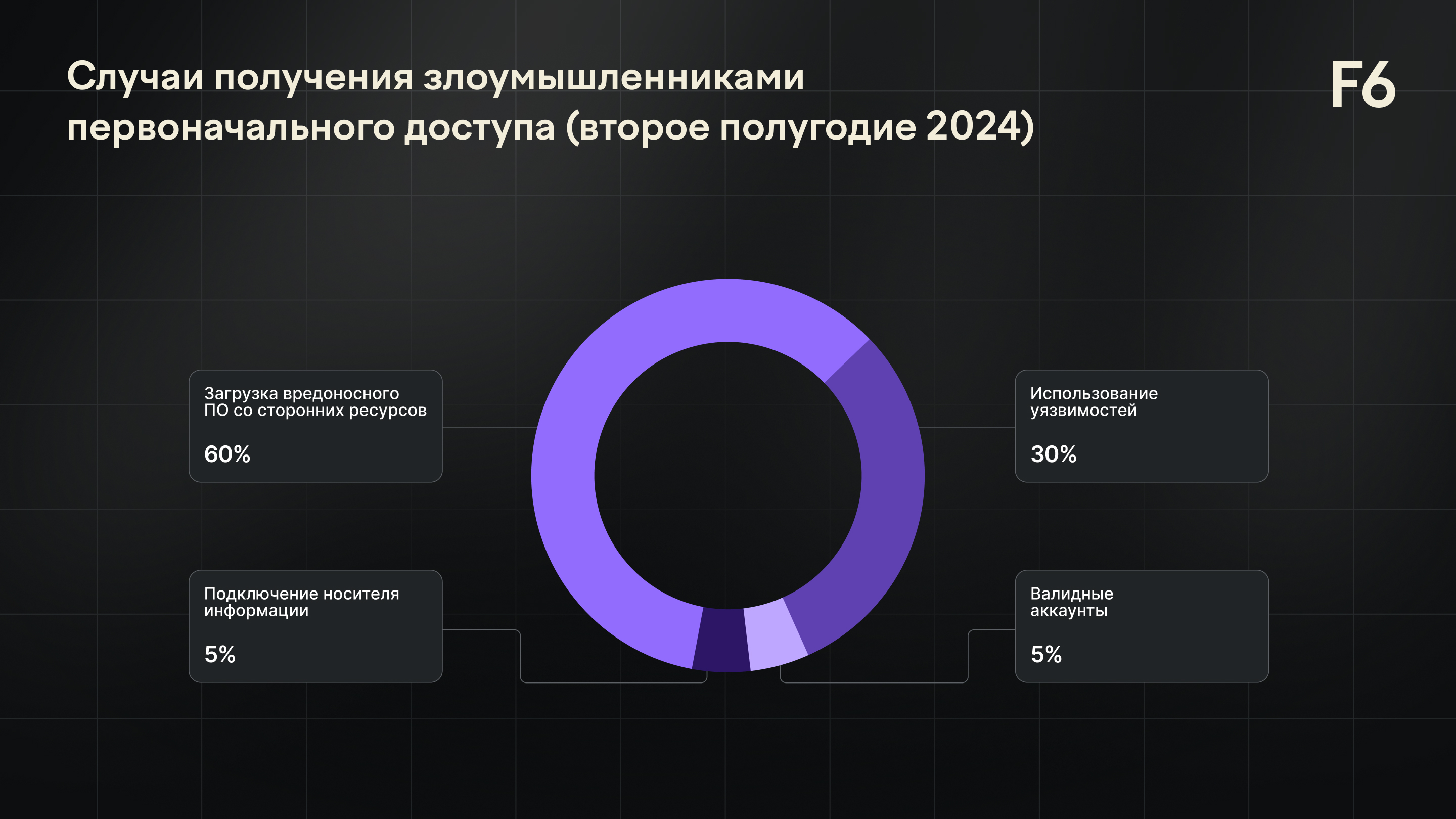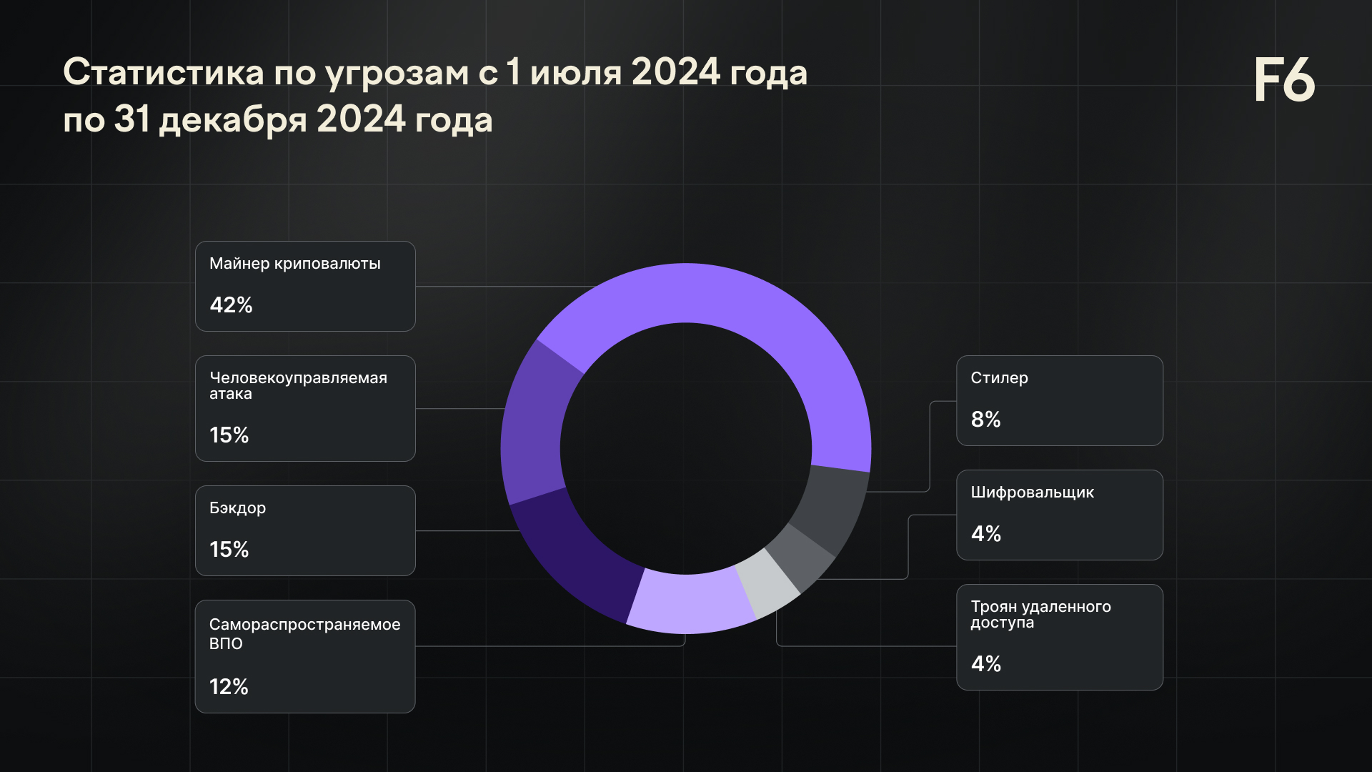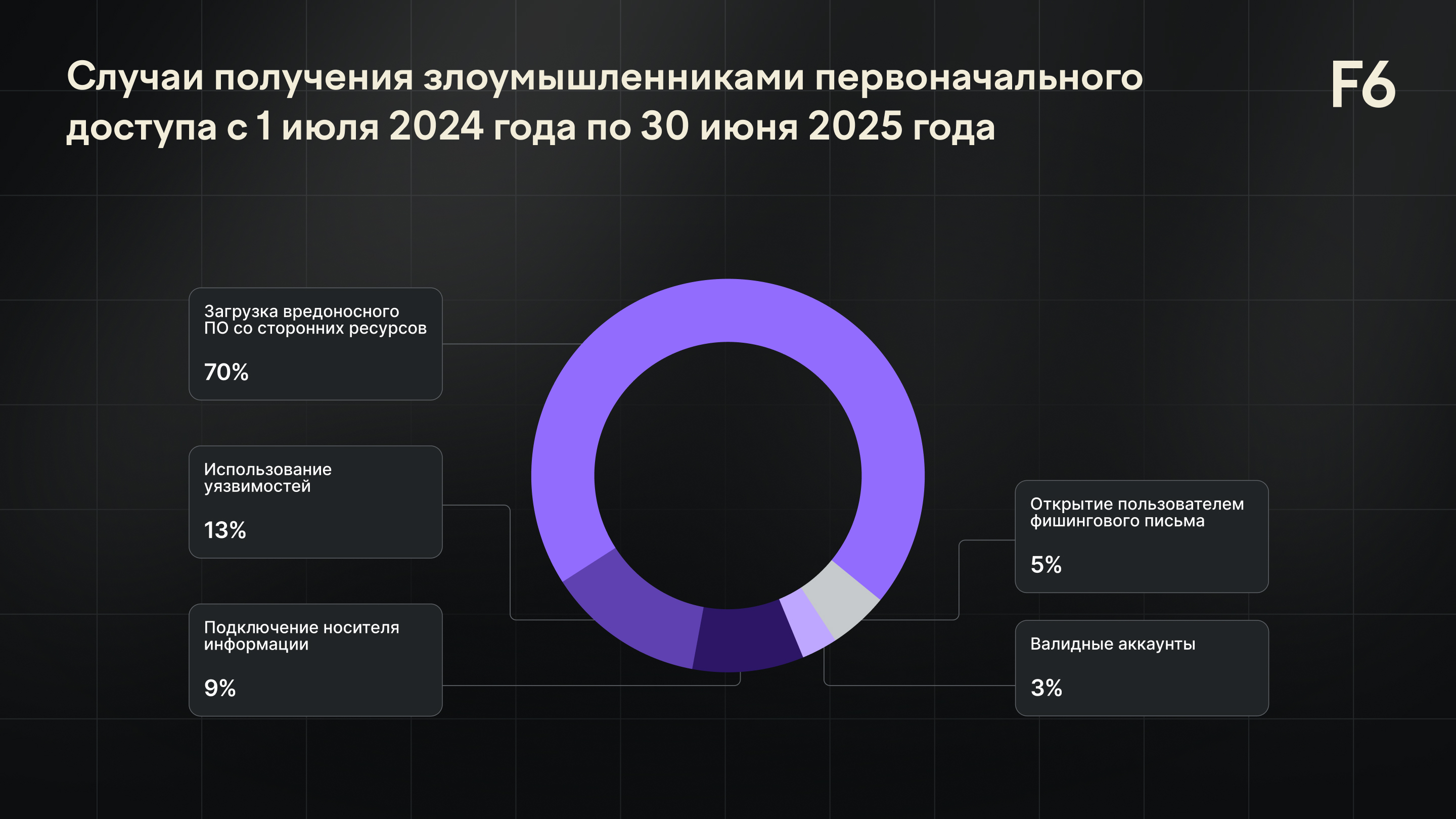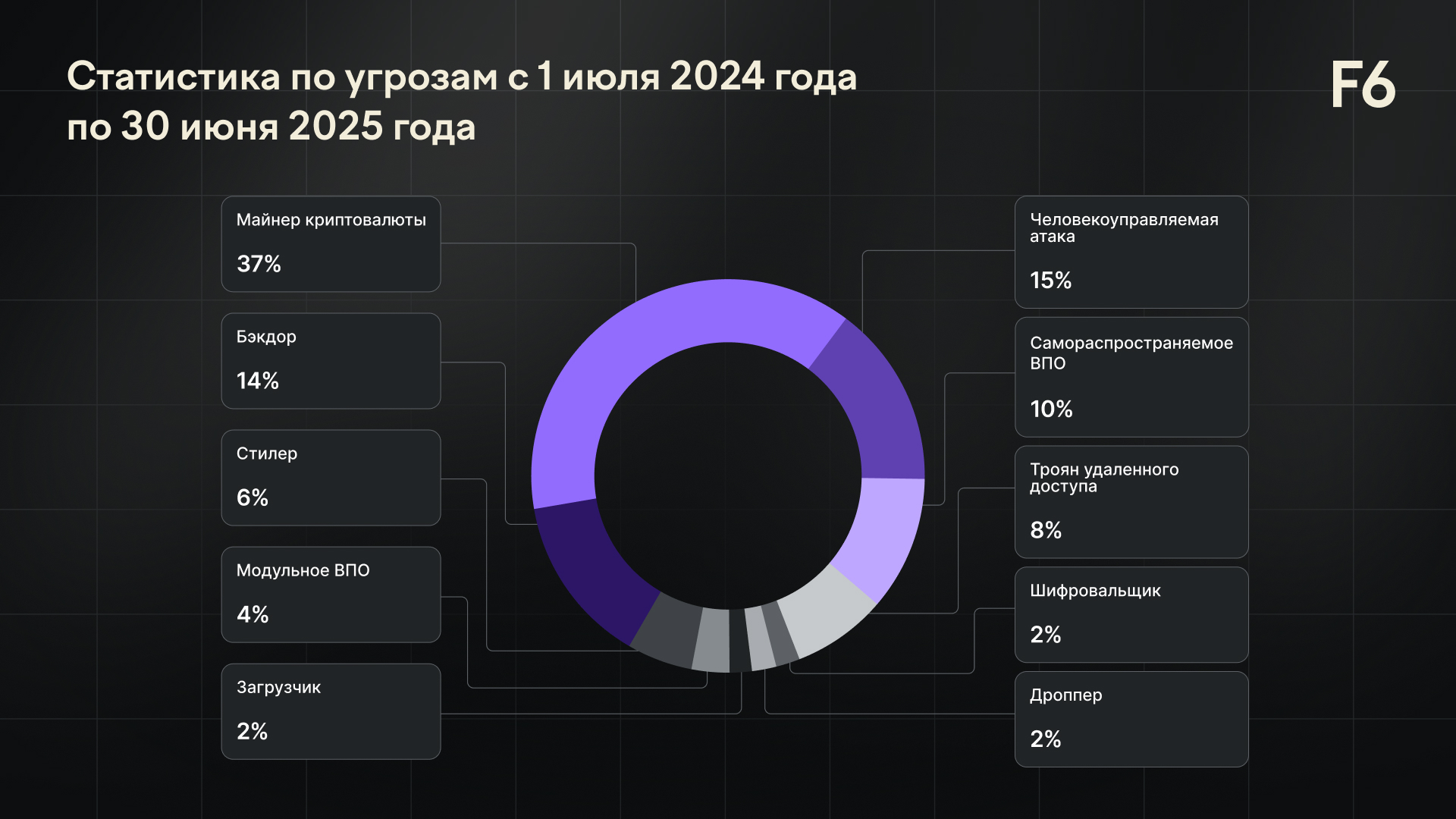Статистика основана на инцидентах высокого уровня критичности и требующих оперативной реакции со стороны аналитиков ЦК F6. При этом угрозы, которые были заблокированы СЗИ на начальной стадии развития, не учитывались.
