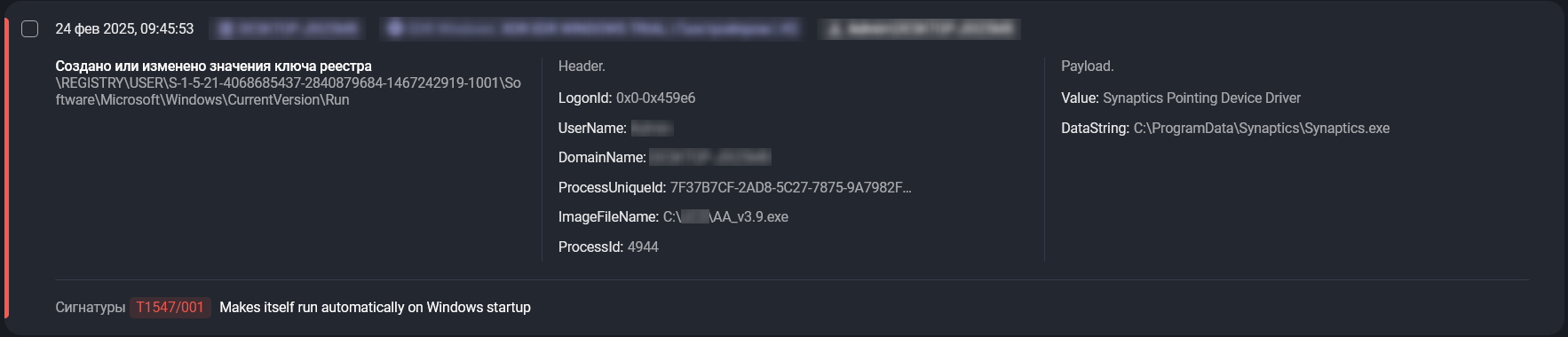 | Ключи запуска в реестре / Папка автозагрузки (T1547.001: Registry Run Keys / Startup Folder) | Изменение ключа реестра Run позволяет запускать исполняемые файлы каждый раз при входе пользователя или включении устройства. Данная техника используется для непрерывного контроля над зараженным устройством. |
