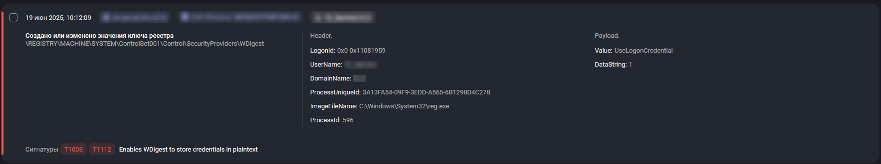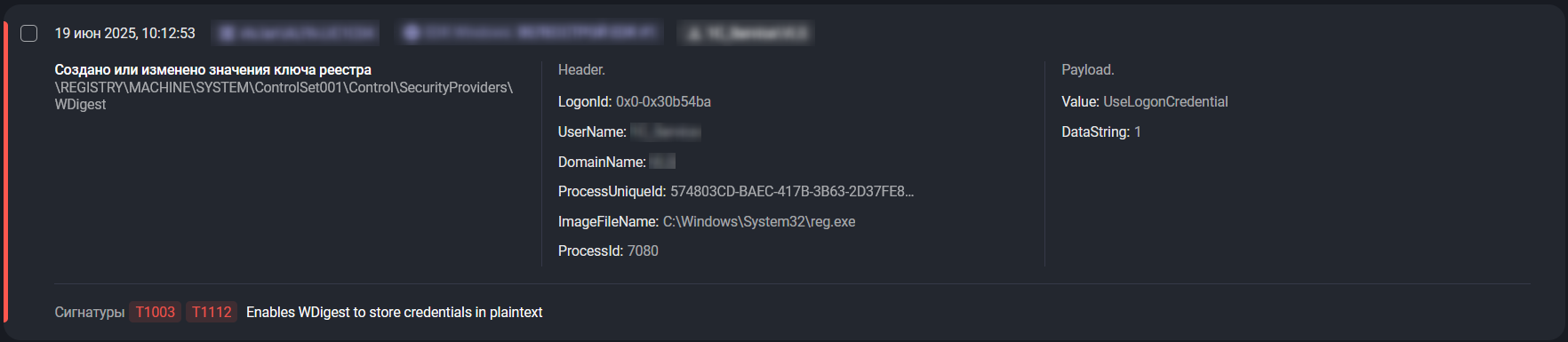 Обнаружение. Аналитики ЦК зафиксировали изменения критических параметров реестра (UseLogonCredential) и использование подозрительных инструментов (Evil-WinRM, PowerShell).