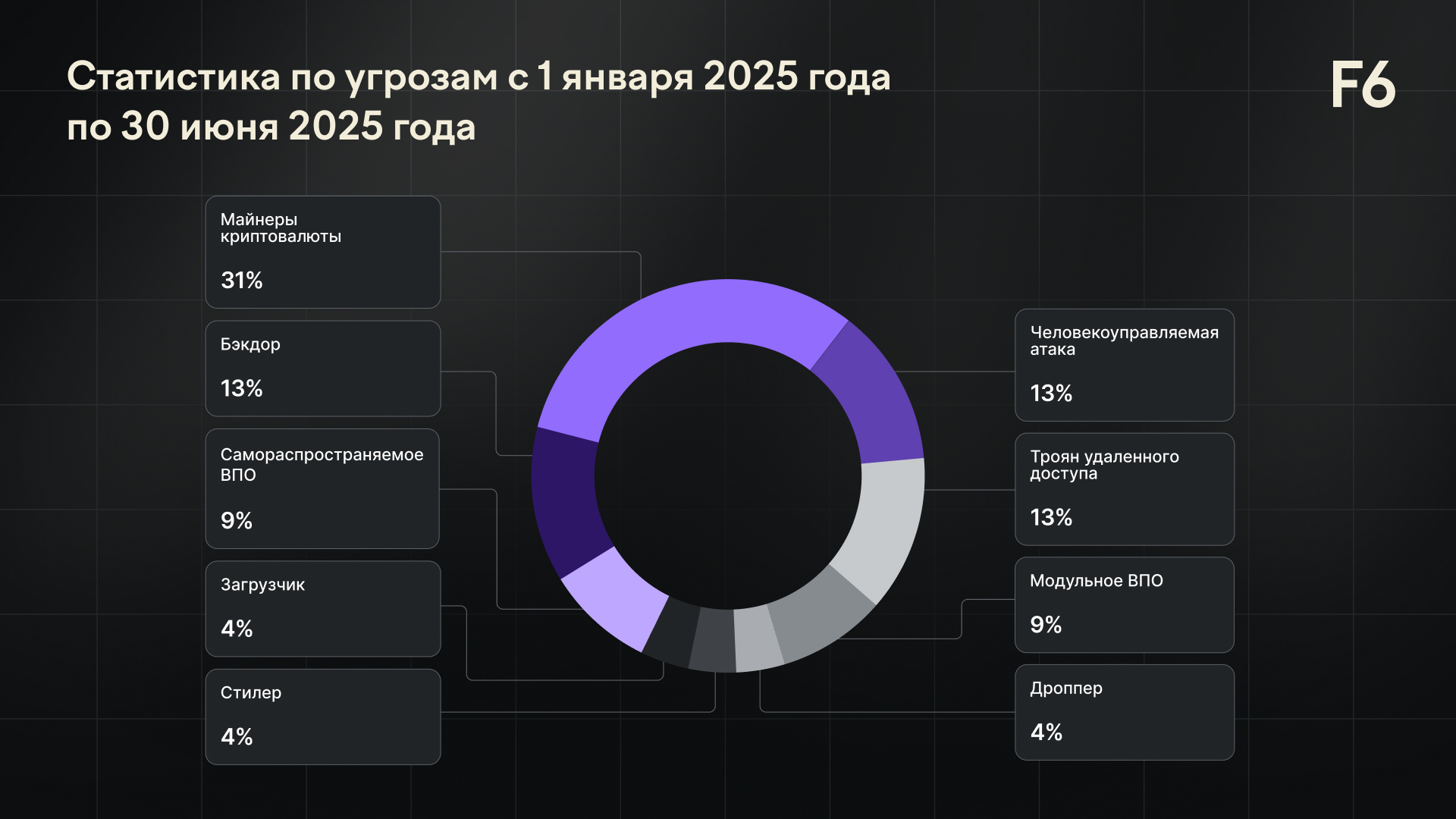 В первом полугодии 2025 года также остаются популярными майнеры криптовалюты (31%). Популярность майнеров может быть обусловлен тем, что за последний год был замечен рост криптовалют, в том числе монеты Monero, которую чаще всего добывали злоумышленники в зафиксированных специалистами ЦК F6 инцидентах.