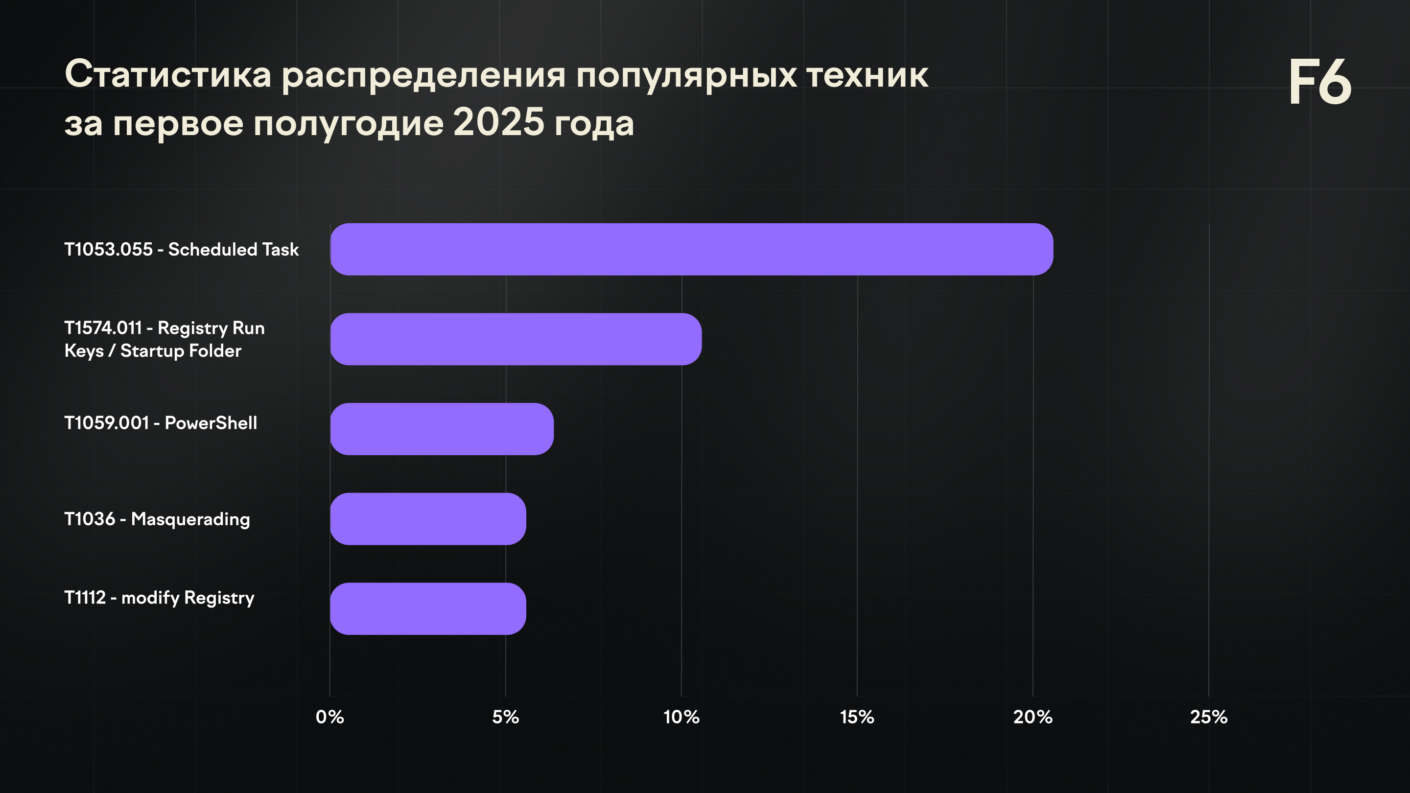 В первой половине 2025 года по сравнению с концом 2024 наблюдается укрепление позиций тактик, связанных с непосредственным выполнением кода и повышением привилегий, что может указывать на рост числа целевых атак. Одновременно сохраняется высокая доля методов обхода защитных механизмов, подтверждающая постоянное стремление злоумышленников скрывать присутствие в инфраструктуре. На уровне техник заметен акцент на использование встроенных системных средств администрирования, в частности планировщика задач и PowerShell, а также появление новых подходов через модификацию реестра и маскировку под легитимные процессы. Это говорит о тенденции к более скрытым атакам, основанным на злоупотреблении штатными возможностями операционных систем.