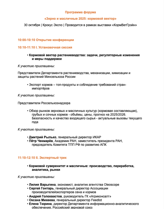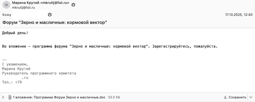 В качестве приманки атакующие использовали программу агропромышленного форума «Зерно и масличные 2025: кормовой вектор», который пройдет 30 октября 2025 года в Москве. Вредоносное вложение «Программа Форум Зерно и масличные.doc» действительно содержит программу форума.
