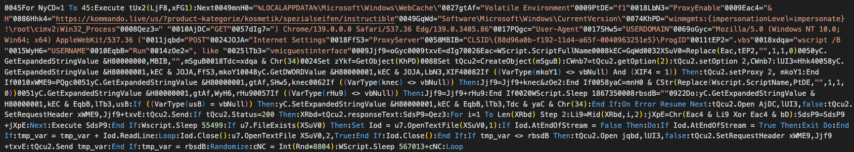 Исполнение данного вложения инициирует запуск механизма доставки полезной нагрузки, который, как сообщалось выше, не изменился. В качестве загрузчика по-прежнему выступает doc-файл-приманка, загружающий посредством шаблона RTF-файл, содержащий эксплойт для уязвимости CVE-2017-11882, который в данном случае загружается по ссылке hxxps://kommando[.]live/us/?legal/terms/trialterms/secno. В результате запуска шаблона и эксплуатации уязвимости происходит загрузка дроппера us.txt по ссылке hxxps://kommando[.]live/us/?secno/achro33, содержащего полезную нагрузку VBShower с С2 hxxps://kommando[.]live/us/?product-kategorie/kosmetik/spezialseifen/instructible.