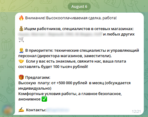 Предложения работы для wannabe-инсайдеров из различных торговых сетей периодически можно встретить в профильных Telegram-каналах. Иногда мошенников разводят другие мошенники или сотрудники службы безопасности: предостережение «Остерегайтесь фальшивых директоров ***», и это не мем из очередного стикерпака, неспроста можно встретить почти под каждым объявлением о поиске инсайдеров.