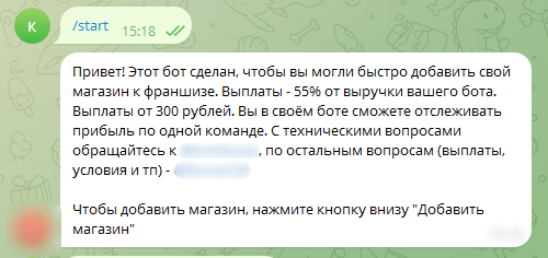 - Истинные бенефециары схемы (те, кто получает выгоду) остаются в тени. Не факт, что они показываются даже в чатах: владельцы и администраторы Telegram-ботов – сами только пешки, которым дали возможность подзаработать на франшизе. Объявления для франчайзи сулят доход в 50-55% от выручки бота, а также быстрый вывод средств и собственную платформу для автоматизации процесса торговли баллами. Всё, что требуется от админа чата – нагнать аудиторию, которая встанет за баллами в очередь.
