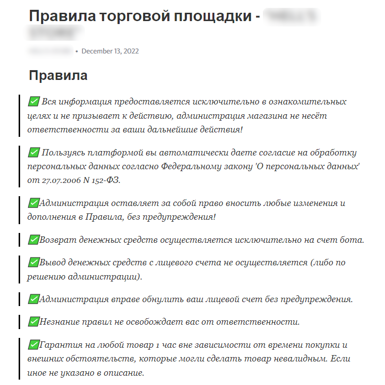 Рисунок 8. Правила торговой площадки на странице одного из мошеннических шопов