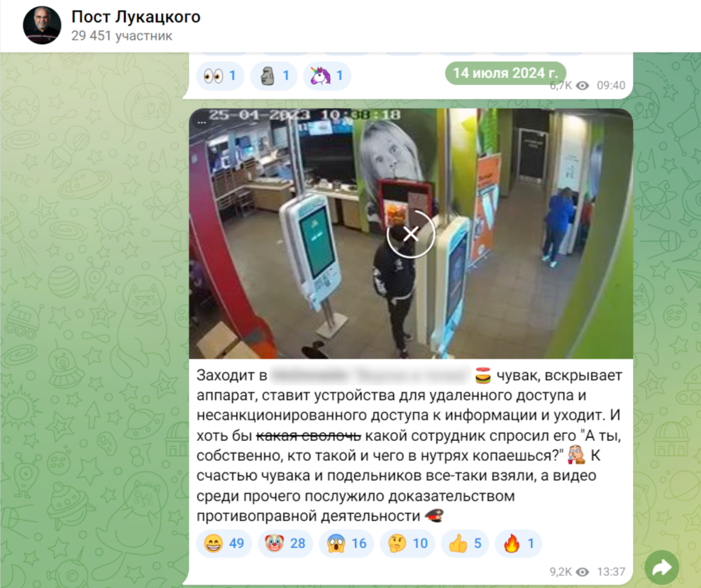 Позволю себе процитировать содержание поста: «Заходит в *** (название ресторана быстрого питания) чувак, вскрывает аппарат, ставит устройства для удаленного доступа и несанкционированного доступа к информации и уходит. И хоть бы какой сотрудник спросил его: «А ты, собственно, кто такой и чего в нутрях копаешься?»»