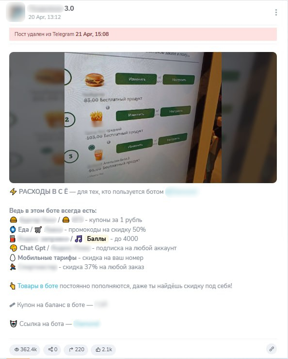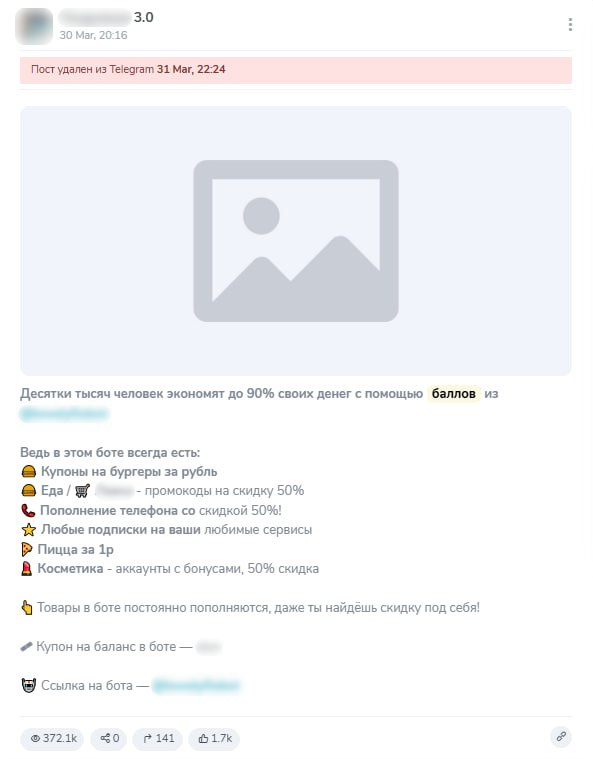 - Вероятно, из-за участившихся блокировок боты стараются маскироваться под законопослушные сервисы — в их описании всё чаще встречаются эвфемизмы. Например: «Цель проекта – создание платформы для сбора и предоставления информации о различных местах, где пользователи могут совершать экономичные покупки или получать услуги». Или: «Магазин цифровых товаров, который приумножает ваш бюджет и экономит до 80% ваших денежных средств!». Однако другие боты сохраняют прямолинейность Останкинской башни и без стыда сообщают, что торгуют баллами и промокодами.
