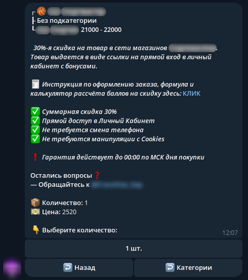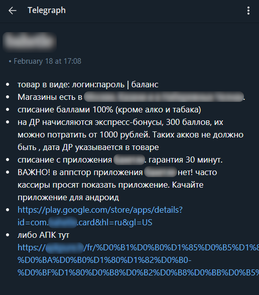 Данные именно этих пользователей впоследствии попадают на витрину очередного Telegram-шопа в виде автоштрихов, где их сможет купить кто угодно, пойти в ближайший магазин и списать баллы со счёта уже на настоящие покупки.