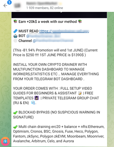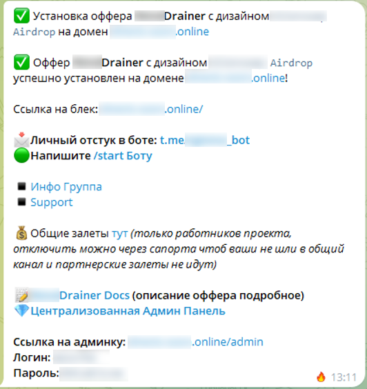 Ссылку на сайт с дрейнером злоумышленник распространяет любым удобным для него способом. Подсказки можно найти во множестве мануалов для обучения новичков. В другом, но связанном с командой боте воркер получает результаты работы дрейнера в реальном времени. Информация о криптоактивах, которые удалось похитить, попадает в канал с профитами. В группе есть бот технической поддержки и бот, который может блокировать домены конкурентов.