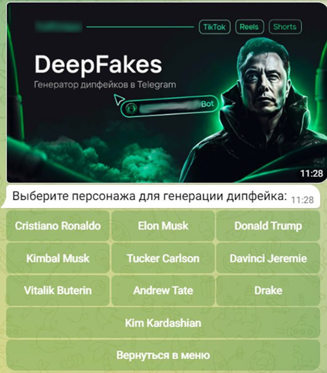 Для генерации дипфейков мошеннические платформы предлагают множество инструментов – как платных, так и бесплатных. Перед созданием дипфейка мошенник выбирает, какую популярную личность использовать. Ассортимент зависит от бота. Например, в представленном ниже предлагается широкий выбор известных как в мире, так и в России персон: миллиардер Илон Маск, американский журналист Такер Карлсон, сооснователь блокчейн-платформы Ethereum Виталий Бутерин, футболист Криштиану Роналду, модель Ким Кардашьян. И впервые появилась возможность создания дипфейков с Дональдом Трампом, голосом которого может быть озвучен любой текст объёмом не более 400 символов.