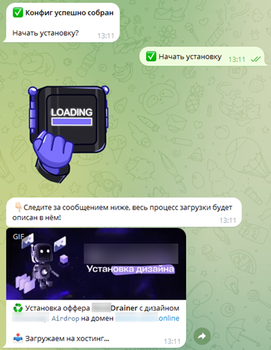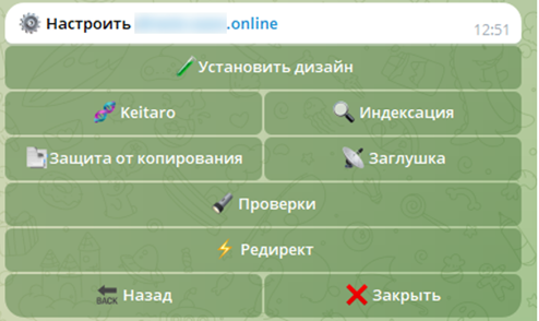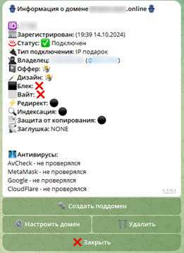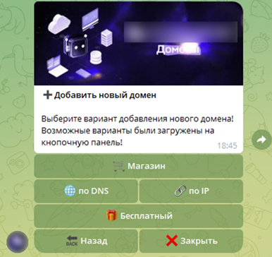Затем злоумышленник переходит к полученному или прикреплённому домену и настраивает его через тот же бот.