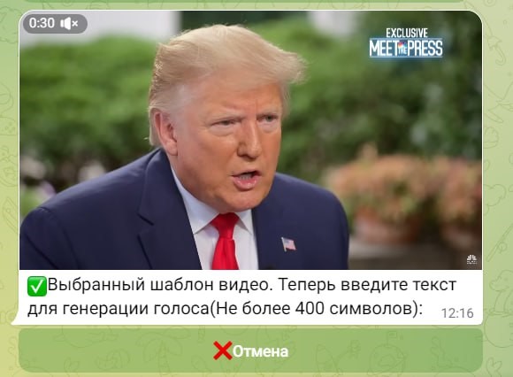 После того, как выбор сделан, бот присылает видео, которое будет использоваться для дальнейшей генерации фейка. Затем предлагается ввести текст, который «озвучит» выбранная знаменитость.