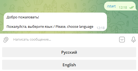 Через бот в Telegram криптоскамеры выполняют основные действия. Во многих ботах предлагают выбрать язык для отображения интерфейса, в основном русский или английский.