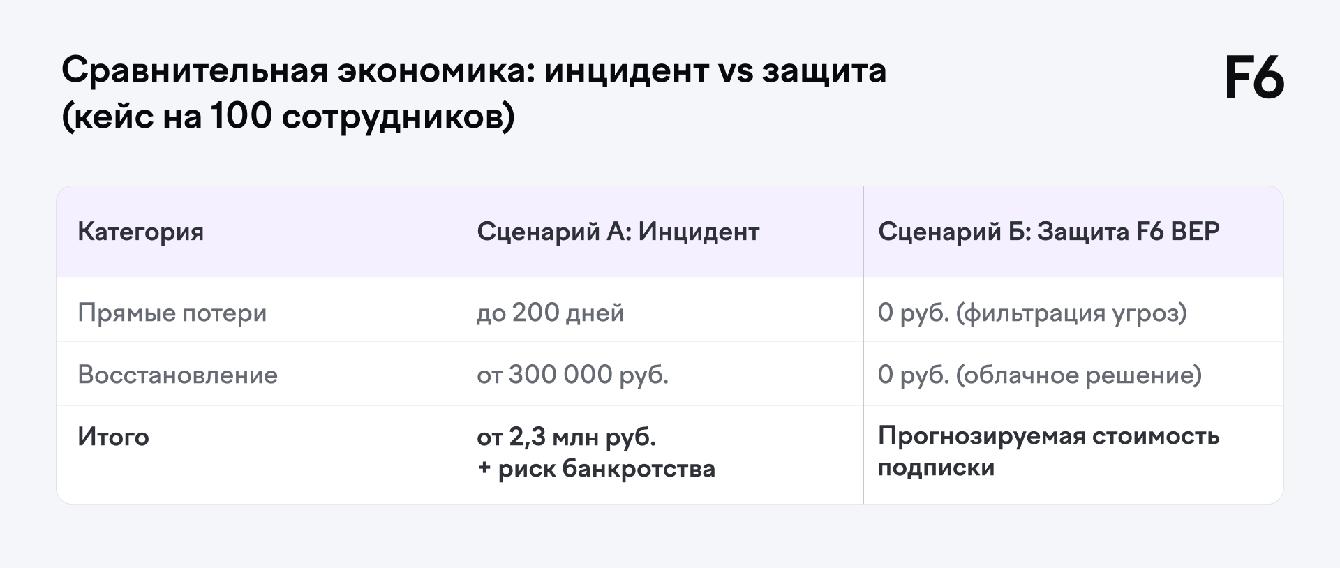 Для бизнеса вопрос информационной безопасности часто упирается в бюджет. Однако данные отчета F6 Аналитика и прогнозы 2025/26 показывают: для бизнеса один инцидент может стоить от 2,3 млн рублей, включая прямые финансовые потери и простой в работе.