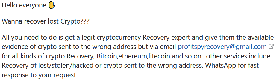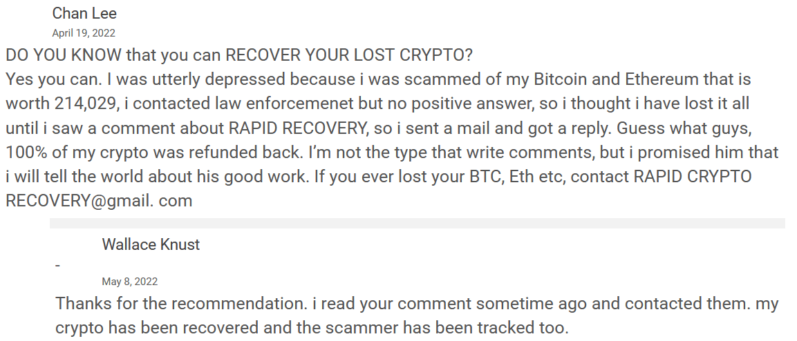 Через некоторое время в комментариях ему отвечал такой же “обманутый пользователь” и писал, что ему помог сервис “Recovery blah-blah-blah”. Уже отчаявшегося человека, как правило, радует новость о возможном возвращении хотя бы части средств.