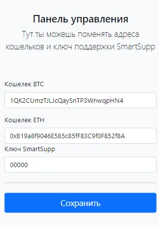 В зависимости от поставщика услуг, состав админской панели может различаться, но в целом он остается достаточно аскетичным. Главная функция такой панели — смена адреса кошелька для переводов и автогенерация QR-адресов.