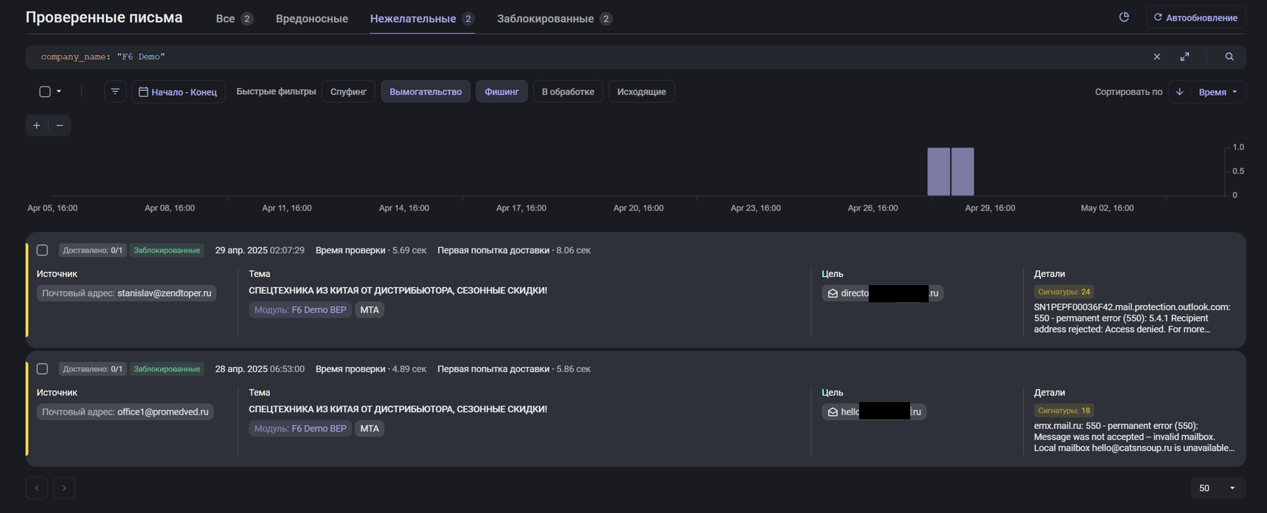 Фильтрация в F6 Business Email Protection прозрачна: вы можете посмотреть, какие письма и почему были отправлены в белый список, какие отнесены к фишингу, вымогательству и другим угрозам.