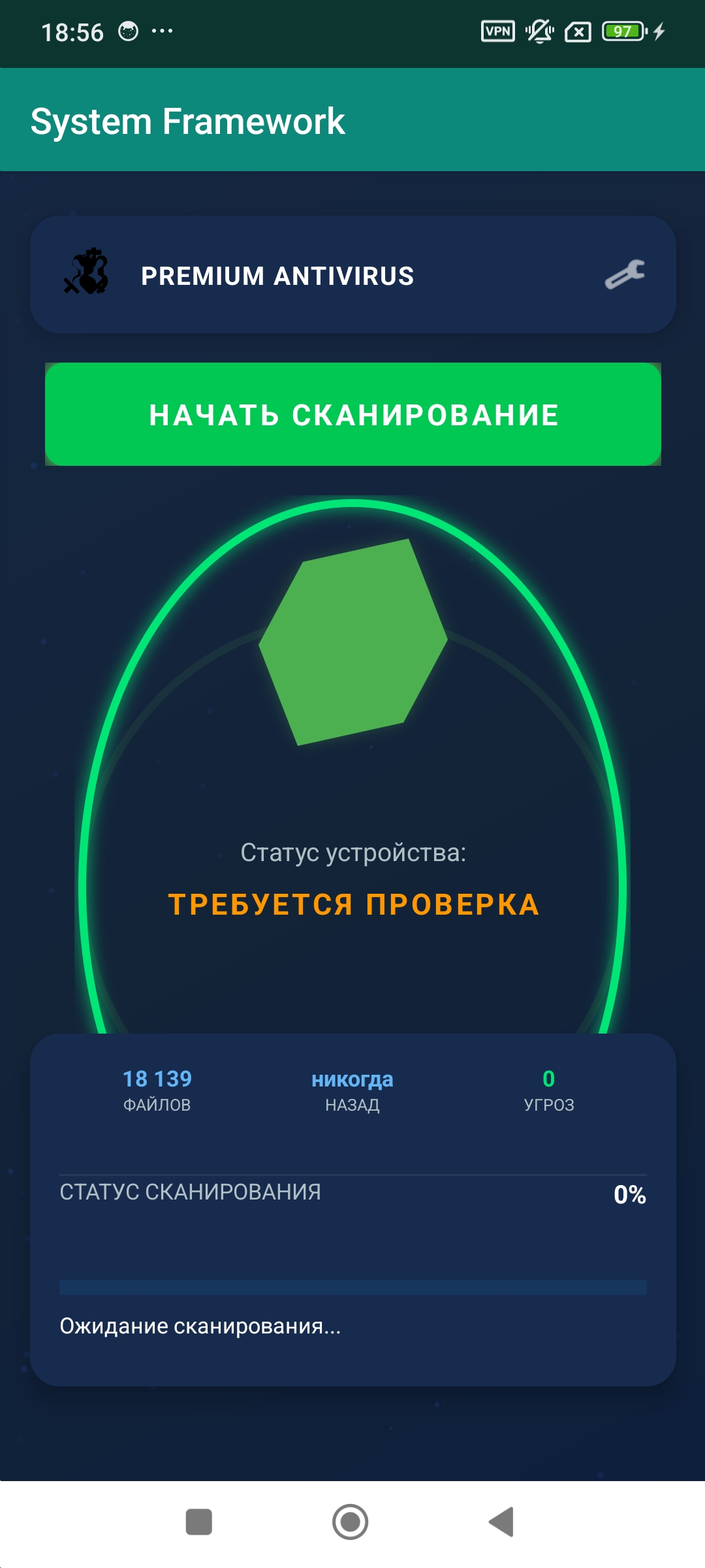 Пользовательский интерфейс приложения представляет собой имитацию интерфейса антивирусного приложения, извещающего пользователя о необходимости произведения сканирования устройства.