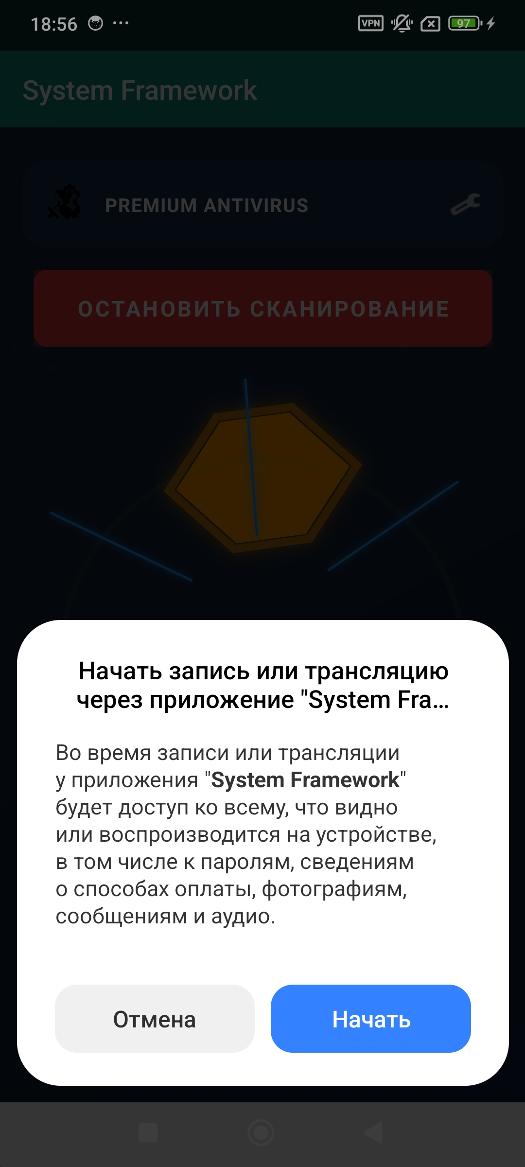 Однако элементы интерфейса, отражающие результаты работы антивируса, такие как количество файлов и угроз, являются случайно сгенерированными. На самом деле при запуске приложения происходит также запуск четырех ранее упомянутых фоновых сервисов — SCamera, SData, SDisplay и Sound. Сервис SDisplay, производящий перехват экрана устройства пользователя, запускает запрос необходимого ему разрешения при нажатии пользователем кнопки «Начать сканирование» в графическом интерфейсе приложения.