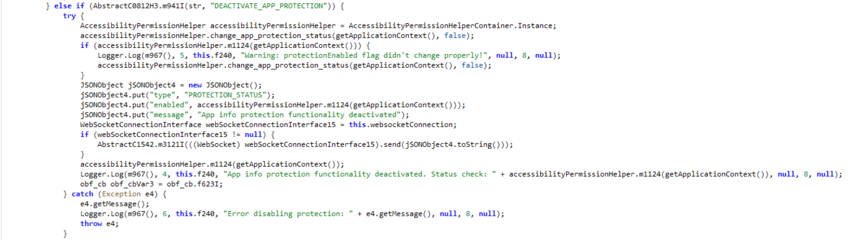 DEACTIVATE_APP_PROTECTION. При получении команды выключается флаг защиты приложения и, соответственно, ранее упомянутая самозащита приложения.