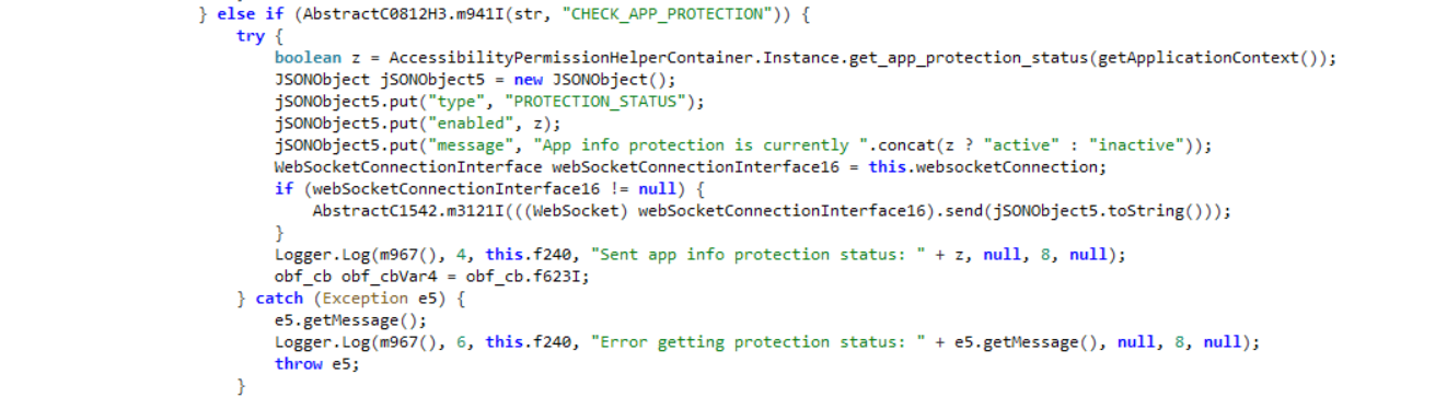 ACTIVATE_APP_PROTECTION. Использование команды активирует защиту приложения. Самозащита приложения заключается в защите ВПО от удаления: приложение отслеживает переход пользователем в список приложений, в свойства ВПО или же переход в определенные разделы настроек. Отслеживание происходит по имеющимся на экране текстовым элементам.