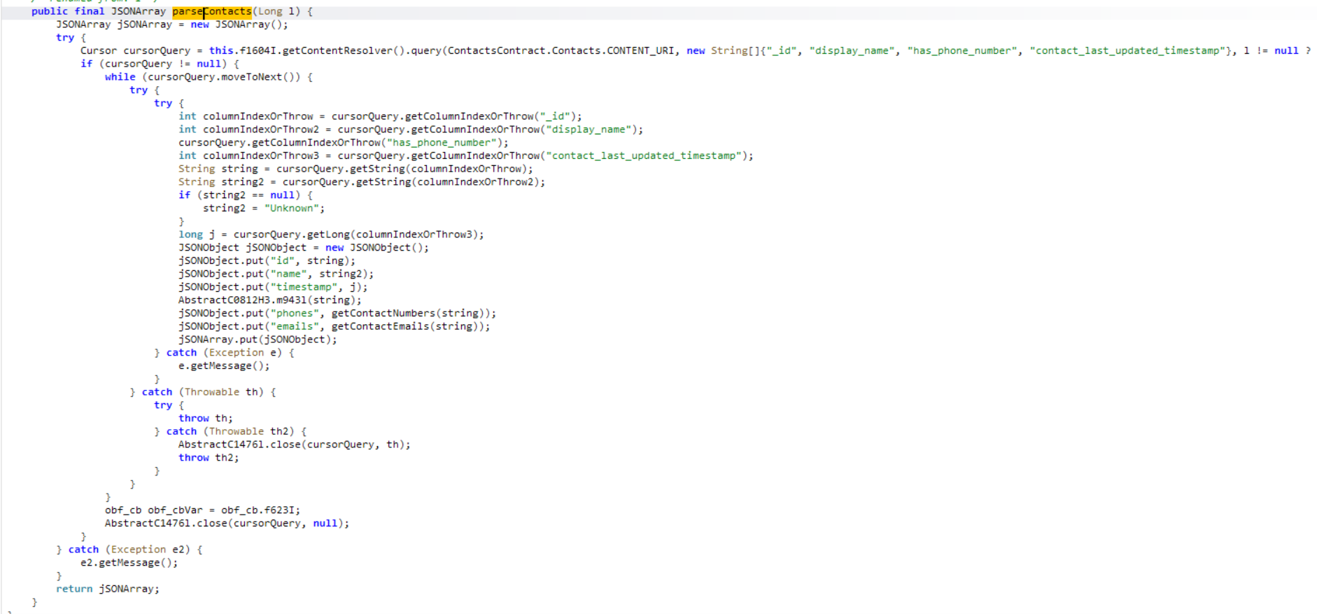 GET_CONTACTS. Команда реализует парсинг списка контактов на мобильном устройстве жертвы, включая номера телефонов и адреса электронной почты. Собранный список контактов отправляется на сервер в виде JSON-структуры, где каждый элемент включает в себя поля свойств контакта: