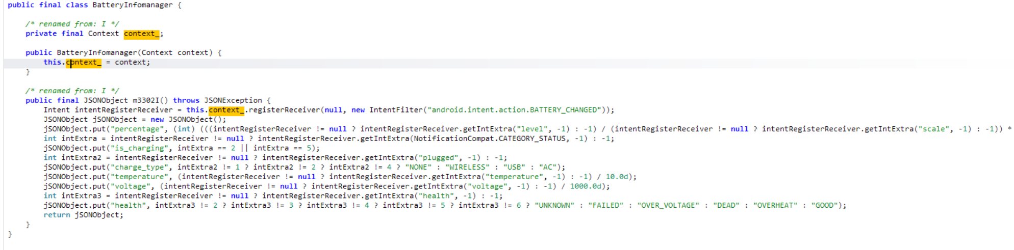 GET_BATTERY_INFO. Команда осуществляет запрос получения информации о состоянии батареи устройства с помощью класса BatteryInfoManager. Собранные данные отправляются в виде JSON-структуры, включающей в себя поля: