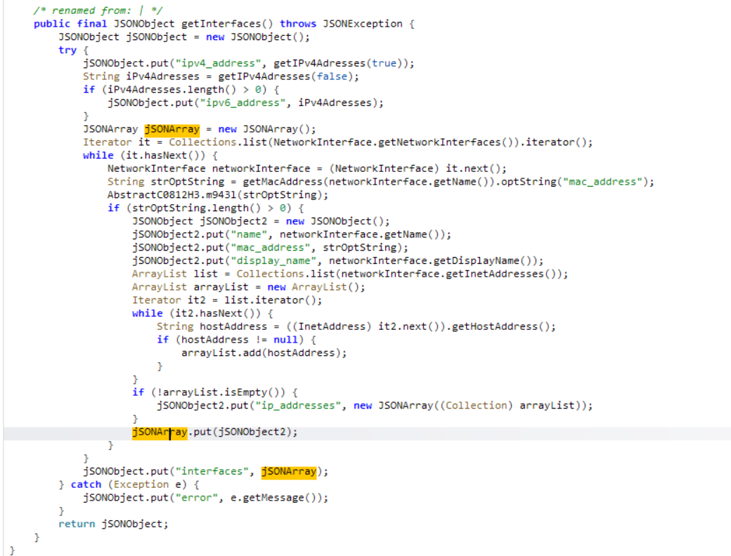 GET_NETWORK_INFO. LunaSpy собирает также и информацию о сетевых интерфейсах зараженного устройства, преобразуя собранные данные в формат JSON и отправляя их на сервер. Для каждого из сетевых интерфейсов устройства в JSON-структуру собираются такие данные, как: