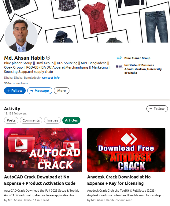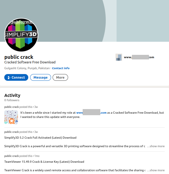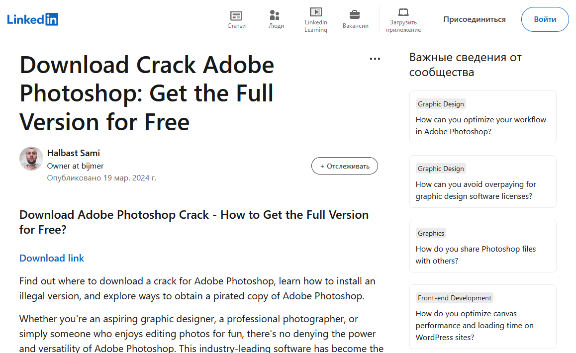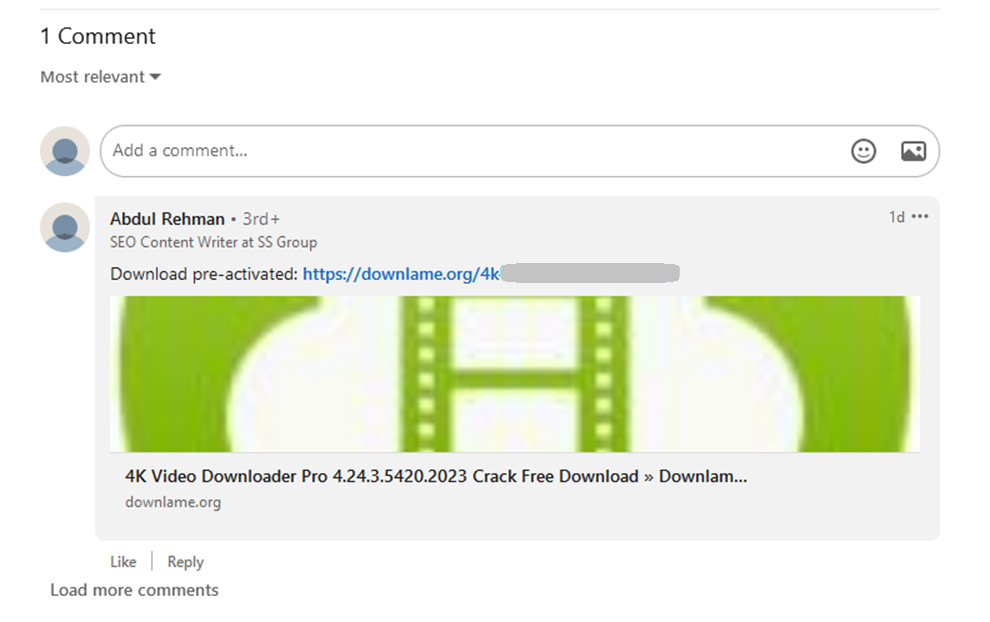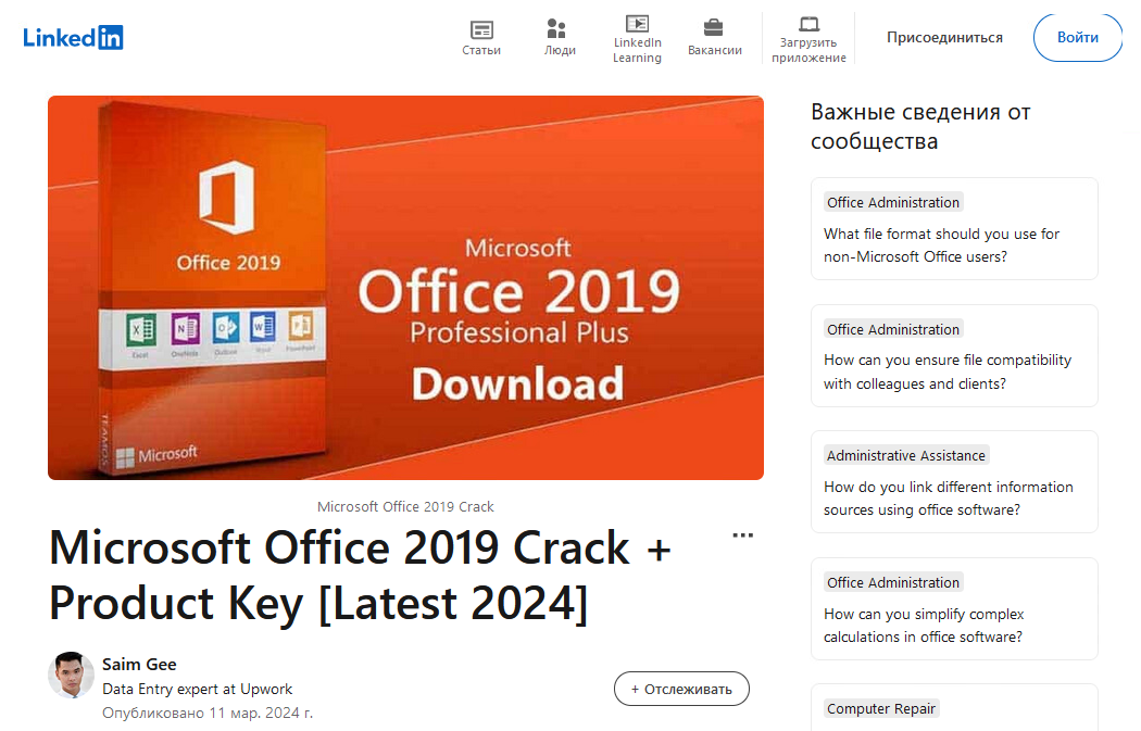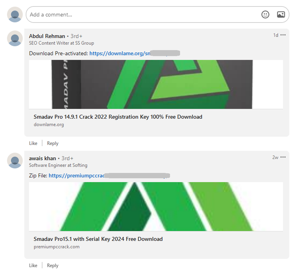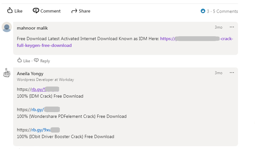 В редких случаях под статьями на LinkedIn могут встретиться комментарии с ссылками на вредоносные ресурсы, которых не было в первоначальной статье. Они все также вели на ресурсы, распространяющие вредоносное ПО под видом кряков.