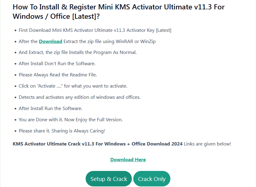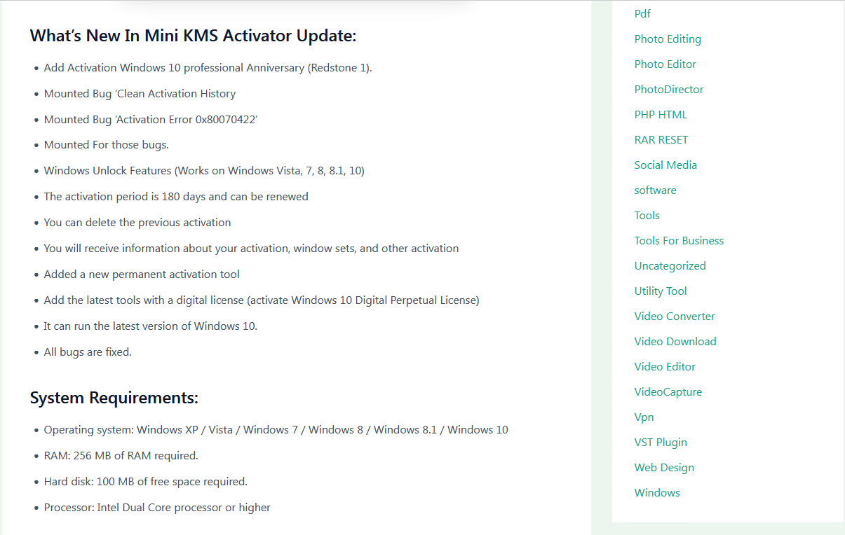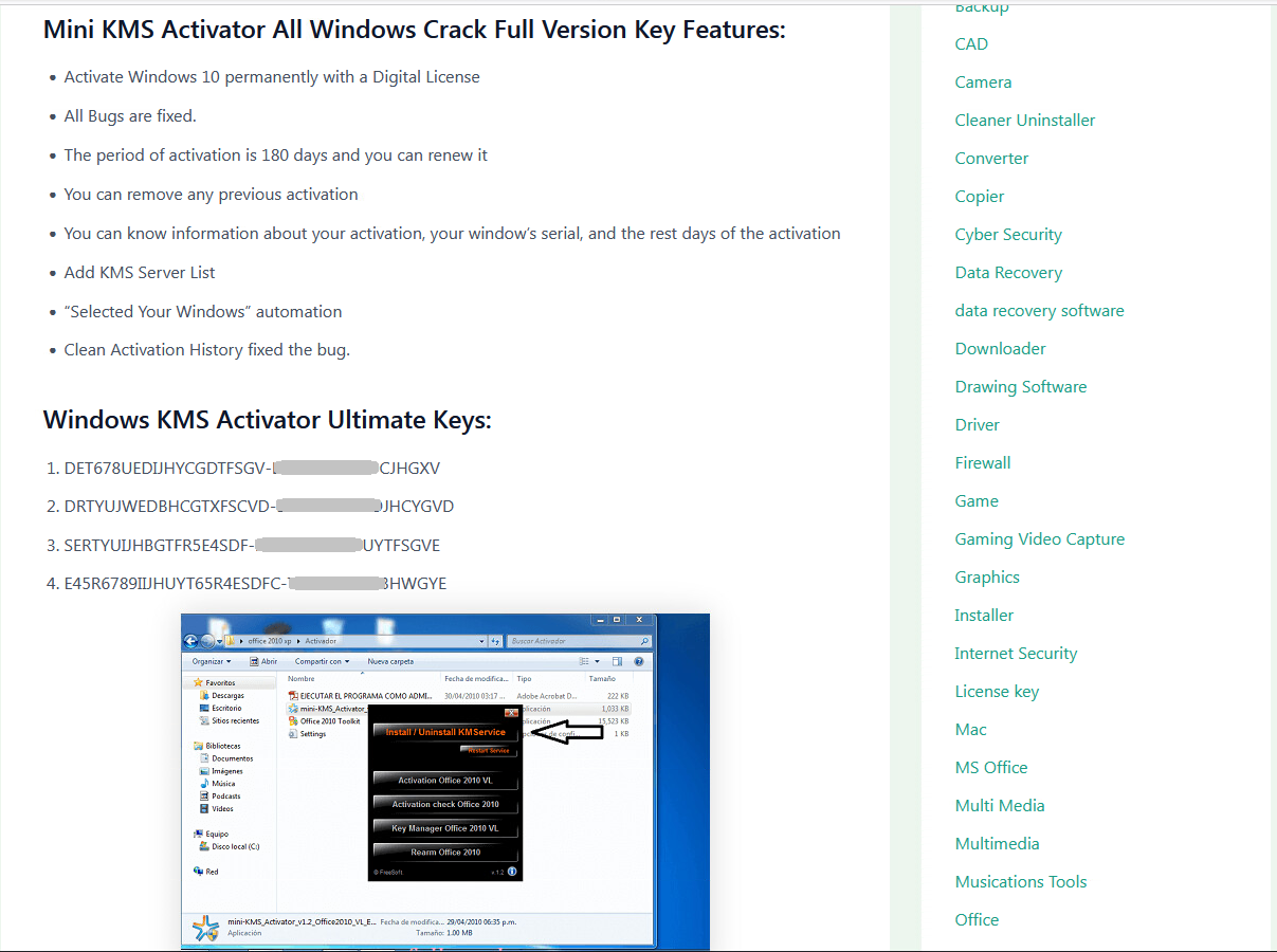 В статьях на этих ресурсах часто указывалось, что программа является абсолютно безопасной, например: «This software is a very safe and easy. Activation program without any harmful effects on the system file» — «Это ПО представляет собой очень безопасную и простую программу активации, не оказывающую вреда на системные файлы». Далее следует описание ключевых особенностей программного обеспечения, нововведений в сравнении с предыдущей версией и функциональных возможностей.