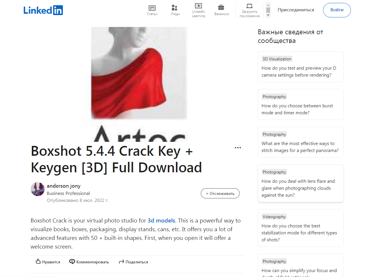 По своему содержанию и наполнению публикации в LinkedIn похожи на статьи, опубликованные на ресурсах, с которых распространяется вредоносное ПО. В начале публикации часто идет описание программы, а также преимущества загрузки, которые обуславливались экономией денежных средств. Далее идет ссылка на прямую загрузку или следующий вредоносный ресурс из цепочки, небольшая инструкция и ключи для активации ПО. Описанные в статьях преимущества нацелены на мотивацию пользователей переходить по ссылкам.