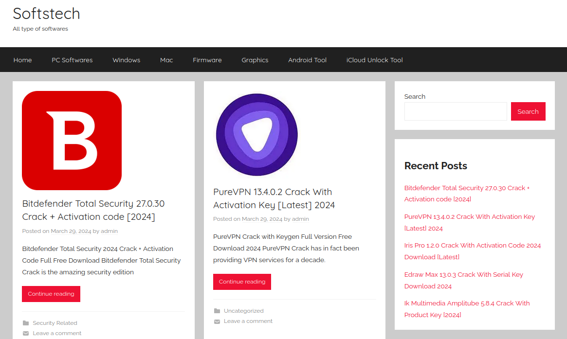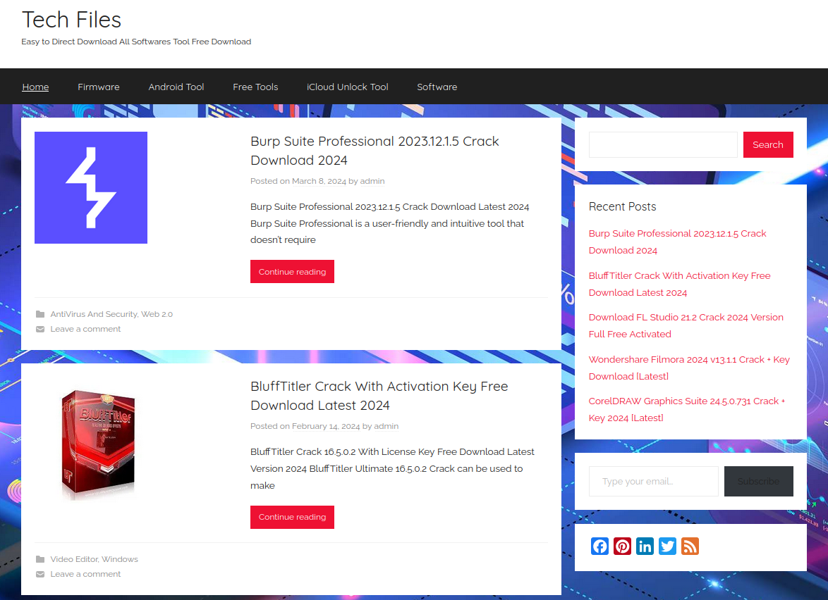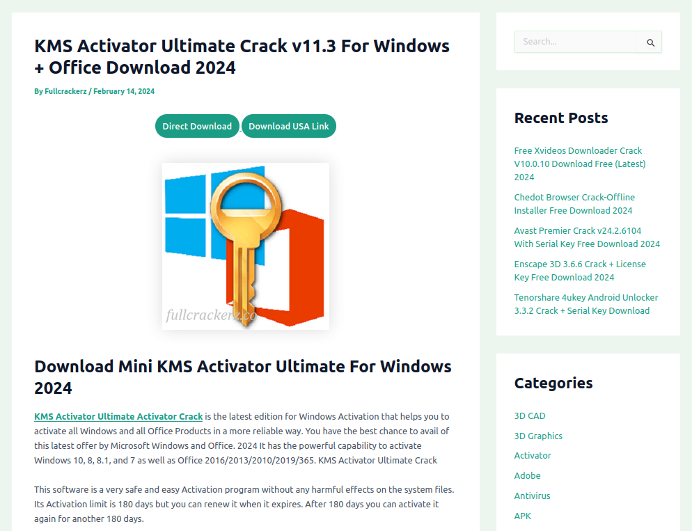 Примечательно, что чаще всего на сайте встречаются авторы с ником admin. В начале веб-страницы содержится краткое описание предлагаемого ПО, например различных пакетов Microsoft Office, решений компании Adobe, AutoCad, Nanocad, программ активации офисных приложений и операционных систем KMS. Также присутствует навигация по сайту с поиском, последними публикациями, выбором категорий и ссылками на социальные сети, такие как Facebook, Twitter, LinkedIn, Pinterest.