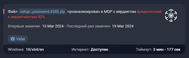В середине марта 2024 года аналитики Центра кибербезопасности компании F6 обнаружили и провели мероприятия по реагированию на инцидент, связанный с загрузкой вредоносного файла на рабочее устройство сотрудника одной российской компании. Модулем динамического анализа MDP файл был автоматически атрибутирован к семейству Vidar — шпионскому ПО, собирающему информацию с компьютера жертвы (рис. 1). Собранные пользовательские данные могут использоваться для угона аккаунтов в мессенджерах, например, Telegram, хищения денежных средств с банковских карт и криптокошельков. Помимо кражи данных, Vidar может применяться в качестве загрузки других модулей вредоносного ПО.