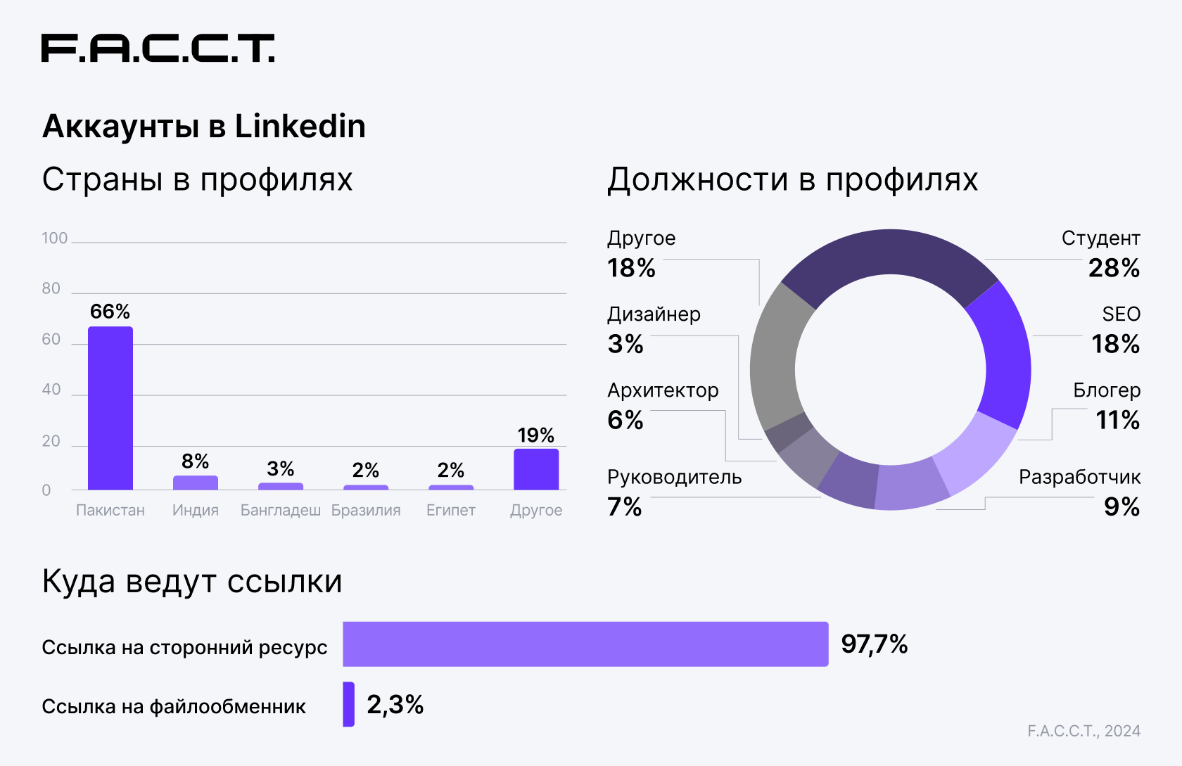 При исследовании вредоносных ресурсов с помощью системы графового анализа компании F6 было также обнаружено, что многие из них были связаны с рекламирующими их аккаунтами из социальной сети LinkedIn. Среди российских ресурсов информацию о преимуществах программ и ссылки на скачивание взломанных версий злоумышленники размещали в популярных социальных сетях, видеохостингах и образовательных платформах.