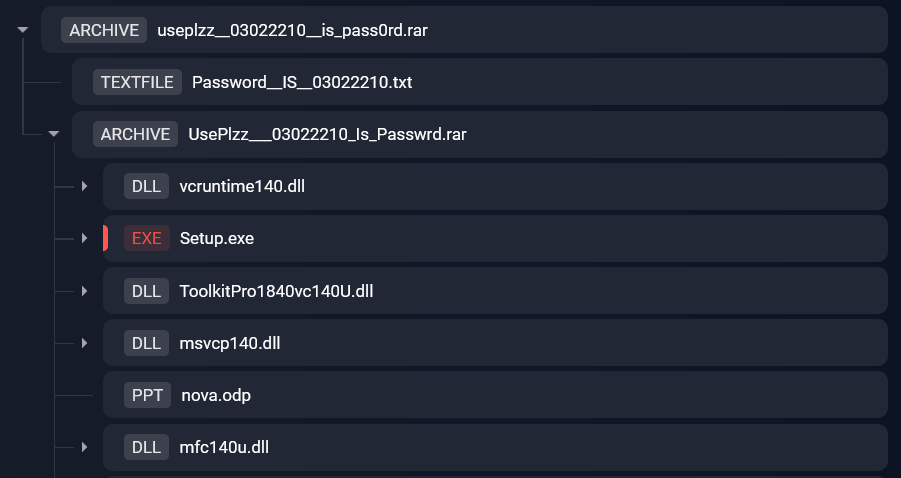 При рассмотрении структуры архивов было установлено, что все они содержат один исполняемый EXE-файл, который является вредоносным ПО, а также другие файлы, которые необходимы для работы такого ПО.