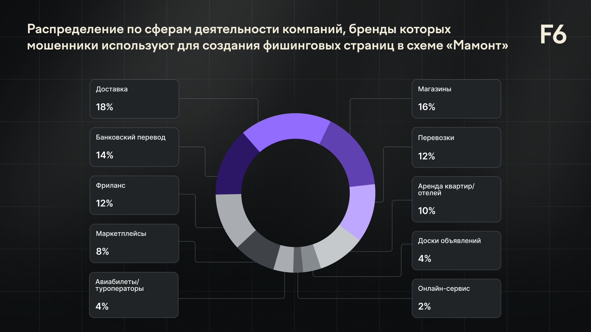 Чаще всего в 2025 году мошенники использовали для создания фишинговых страниц в схеме «Мамонт» бренды сервисов доставки (18%), онлайн-магазинов (16%), сервисов банковских переводов (14%), грузоперевозок и бирж фриланса (по 12%). Также популярным прикрытием для злоумышленников остаются бренды сервисов аренды квартир и мест для отдыха (10%), маркетплейсов (8%) и сервисов бесплатных объявлений (4%).