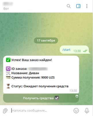 Жертве скидывают ссылку на Telegram-бот, похожий на официальный бот компании, и код-идентификатор заказа.