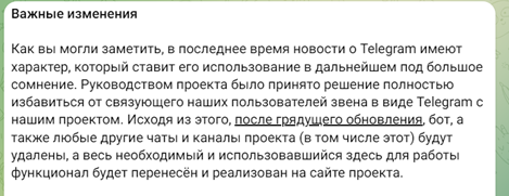 Рис.17. Сообщение в одной из мошеннических групп об уходе с Telegram